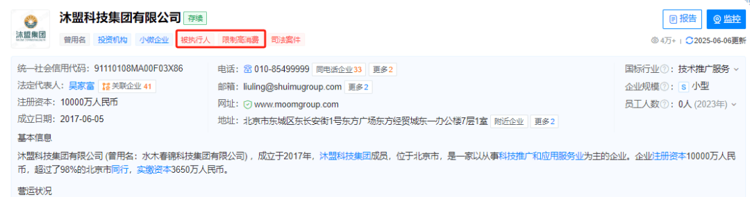 据天眼查资料,沐盟集团成立于2017年,位于北京市,是一家以从事科技推广和应用服务业为主的企业。2024年至今已涉9起司法案件。公司实控人吴家富于2025年5月13日被北京市东城区人民法院下达限制消费令。