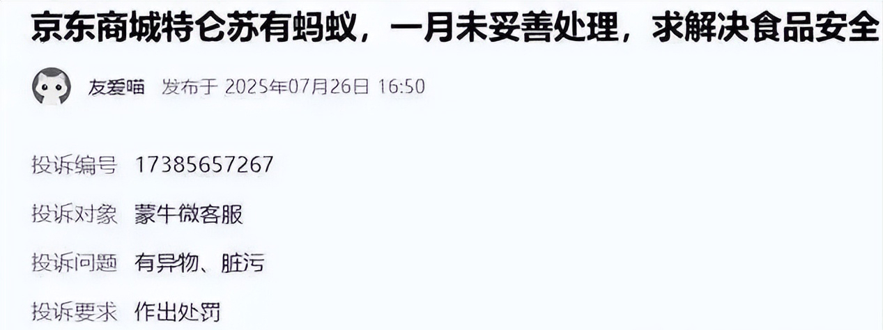 蒙牛特仑苏牛奶里竟喝出蚂蚁?类似投诉也出现在其他平台上