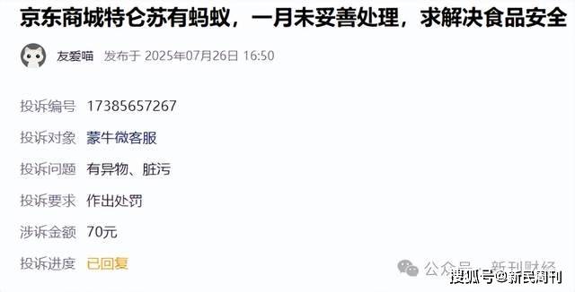 7月26日,黑猫投诉平台上一则消费者投诉显示,其在京东商城购买的特仑苏牛奶存在食品安全问题。据投诉者描述,其于6月6日购买了两箱特仑苏牛奶,饮用时发现牛奶中有黑色异物,经仔细辨认确认为黑色蚂蚁。消费者表示,问题发生后已向平台反映,但时隔一个月仍未得到妥善处理,故通过投诉平台寻求解决。