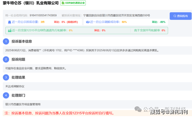 根据全国12315平台最新公示数据,以“特仑苏”为关键词共检索到78条投诉记录,其中多起投诉关联蒙牛特仑苏(银川)乳业有限公司。投诉内容主要集中在食品安全问题,消费者普遍诉求为退赔货款及损失赔偿。数据显示,平台近一月公示相关投诉2件,调解成功率为50%。
