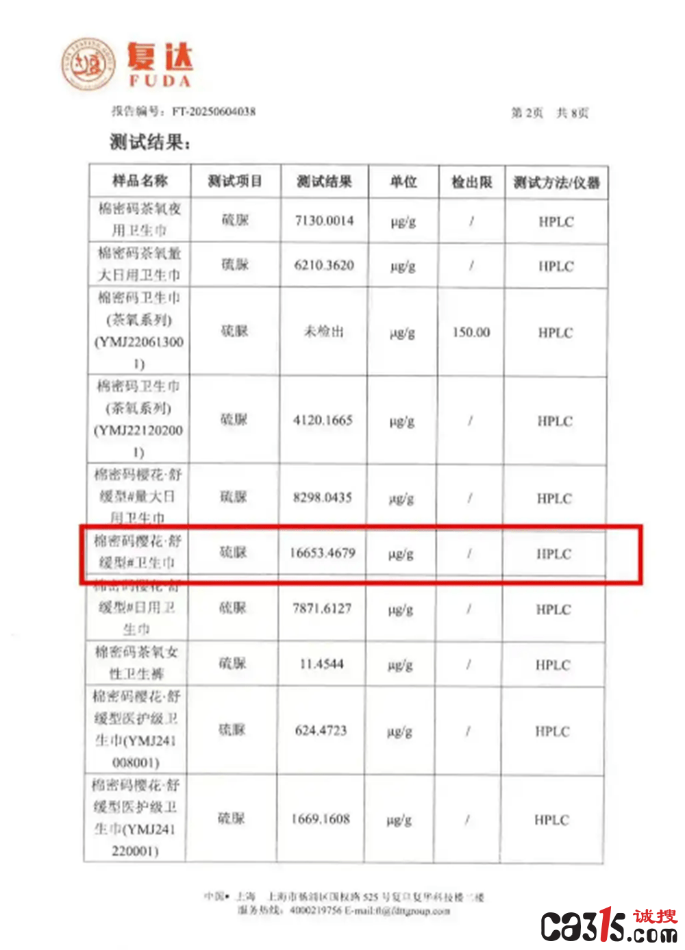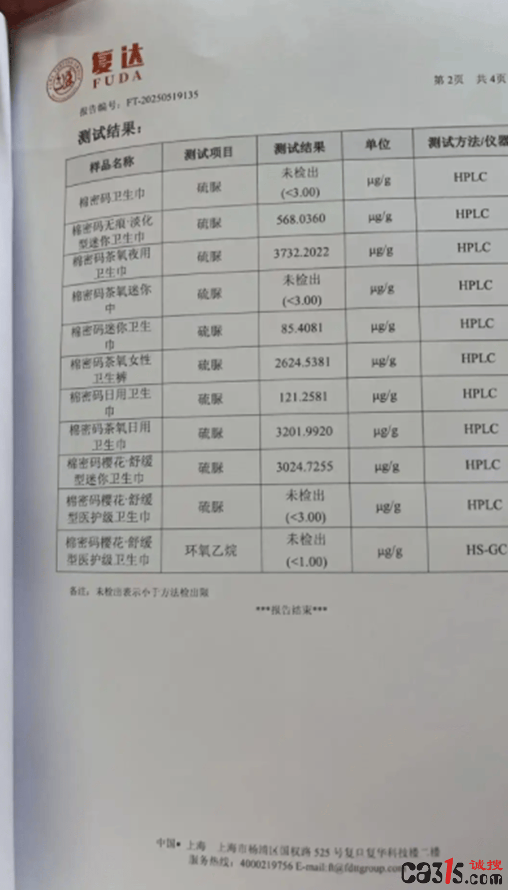 今年6月,由某官方机构送检的14份样品中,其中一款卫生巾硫脲含量甚至高达16653.4679μg/g。受访者供图