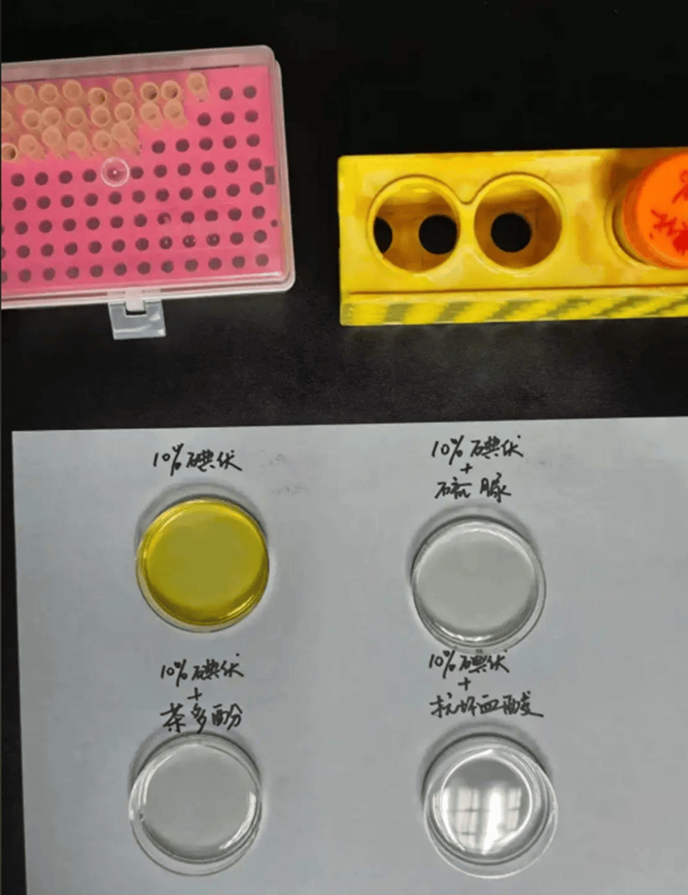 碘伏溶液与相同浓度的硫脲、茶多酚与抗坏血酸(俗称维生素C)进行反应实验,静止3小时后的褪色效果对比。受访者供图