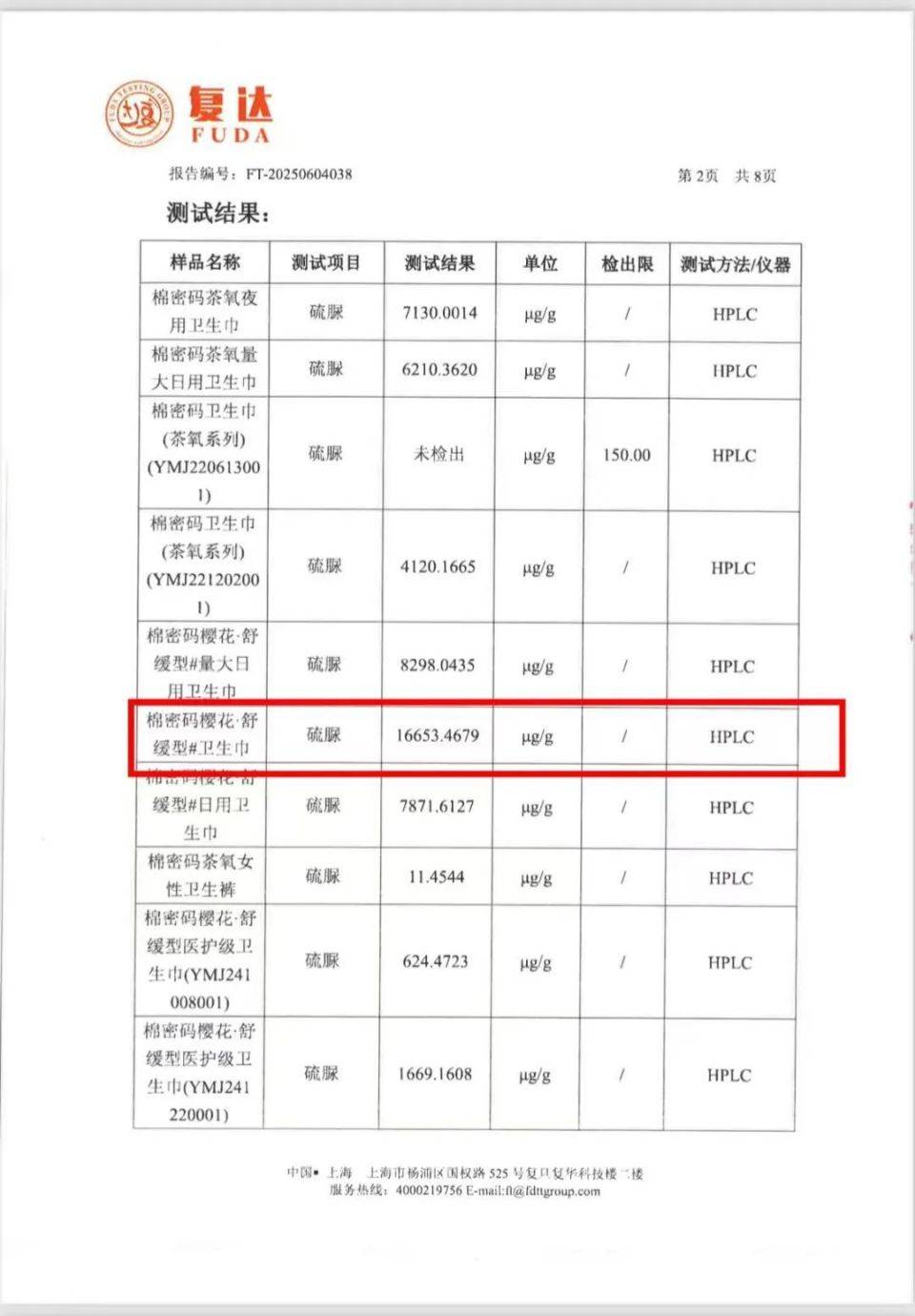 7月24日,辛巴自创品牌“棉密码”卫生巾被检出超高含量致癌物硫脲,多款产品超标严重。检测报告显示,从2019年9月到2025年1月,多个批次的棉密码卫生巾均检出硫脲,其中一款棉密码樱花·舒缓型卫生巾的硫脲含量高达16653.4679μg/g。
