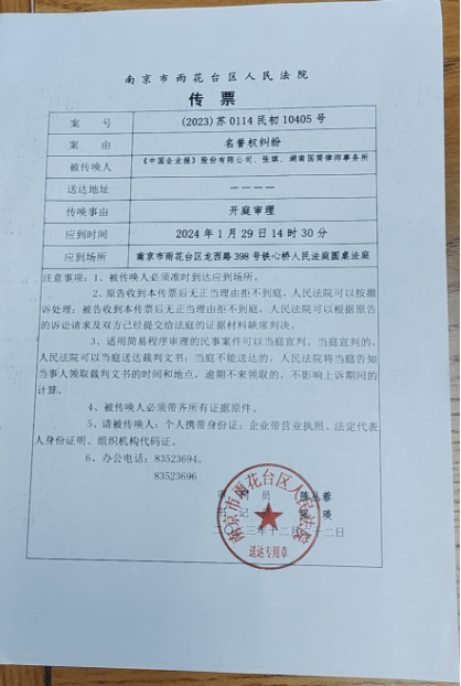 令人没有想到的是,2023年12月《中国企业报》股份有限公司、湖南国简律师事务所及张琪本人突然接到南京市雨花台区人民法院关于江苏闻闻网络科技有限公司诉上述单位及个人涉名誉权纠纷的传票。