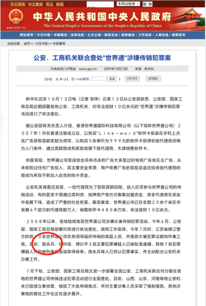 不仅如此,《中国企业网》在调查时还发现,江苏闻闻网络科技有限公司控股股东施某兵曾涉及“世界通”10亿元传销大案。2011年3月,江苏省镇江市京口区法院以组织、领导传销活动罪对其判处有期徒刑九年。