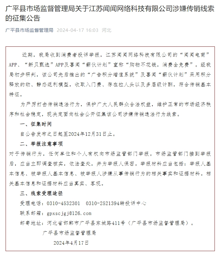 2024年4月17日,江苏闻闻网络科技有限公司一度被河北某地市场监管部门征集涉嫌传销线索。