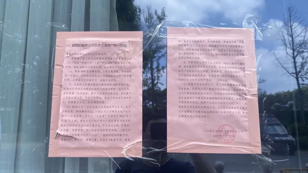 树拍易购接待中心大楼墙上,张贴着山东数科易购商务有限公司的一张告示,落款为7月21日。行文一如7月23日晚上王绍庆那场只闻其声的直播。