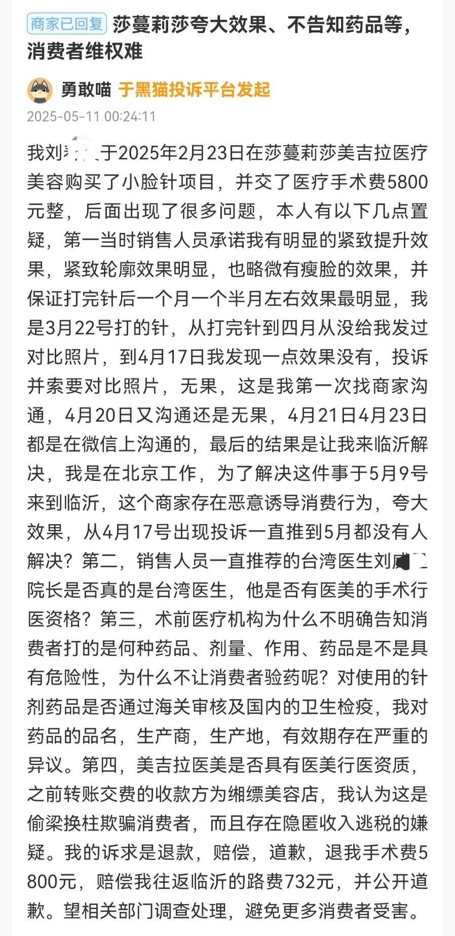 该消费者称,其于2025年2月23日在莎蔓莉莎美吉拉医疗美容购买了小脸针项目,并交了医疗手术费5800元,后面出现了很多问题。当时销售人员承诺有明显紧致提升效果,紧致轮廓效果明显,也略微有瘦脸的效果,并保证打完针后一个月到一个半月左右效果最明显。