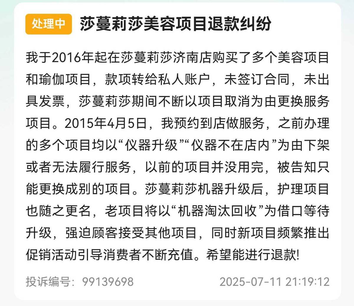 该消费者还提到,莎蔓莉莎机器升级后,同时护理项目也随之更名,老项目将以“机器淘汰回收”为借口等待升级,强迫顾客接受其他项目,同时新项目频繁推出促销活动引导消费者不断充值。目前,该消费者希望能进行退款。截至深度美业发稿前,该投诉尚在处理中。