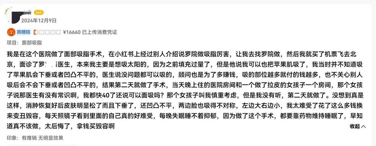 2024年12月9日,一位消费者分享了其在该院进行面部吸脂手术的失败经历。她通过小红书了解到该院罗姓院长擅长吸脂,特意购买机票飞往北京面诊。