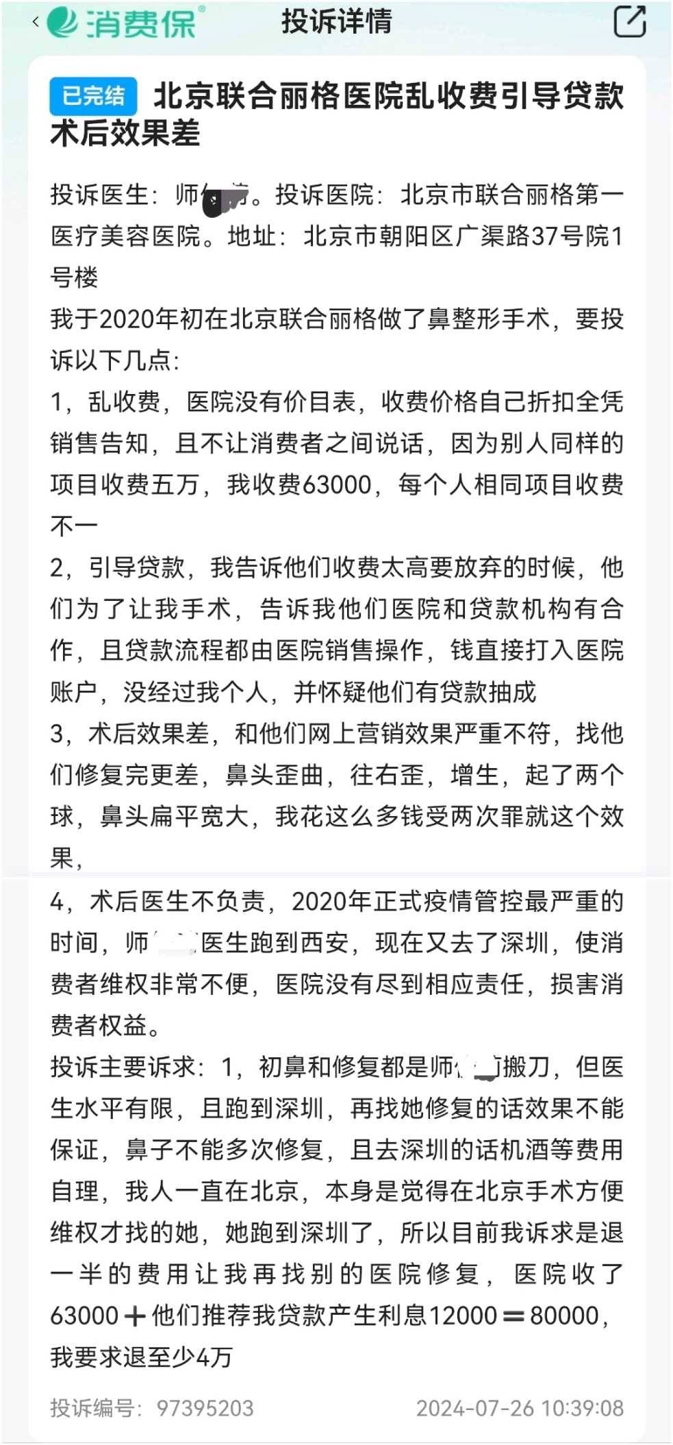 消费保平台另一起投诉则指医院无公开价目、随意定价并代操作贷款,术后效果差且主刀医生离京致维权困难,患者要求退还部分费用。