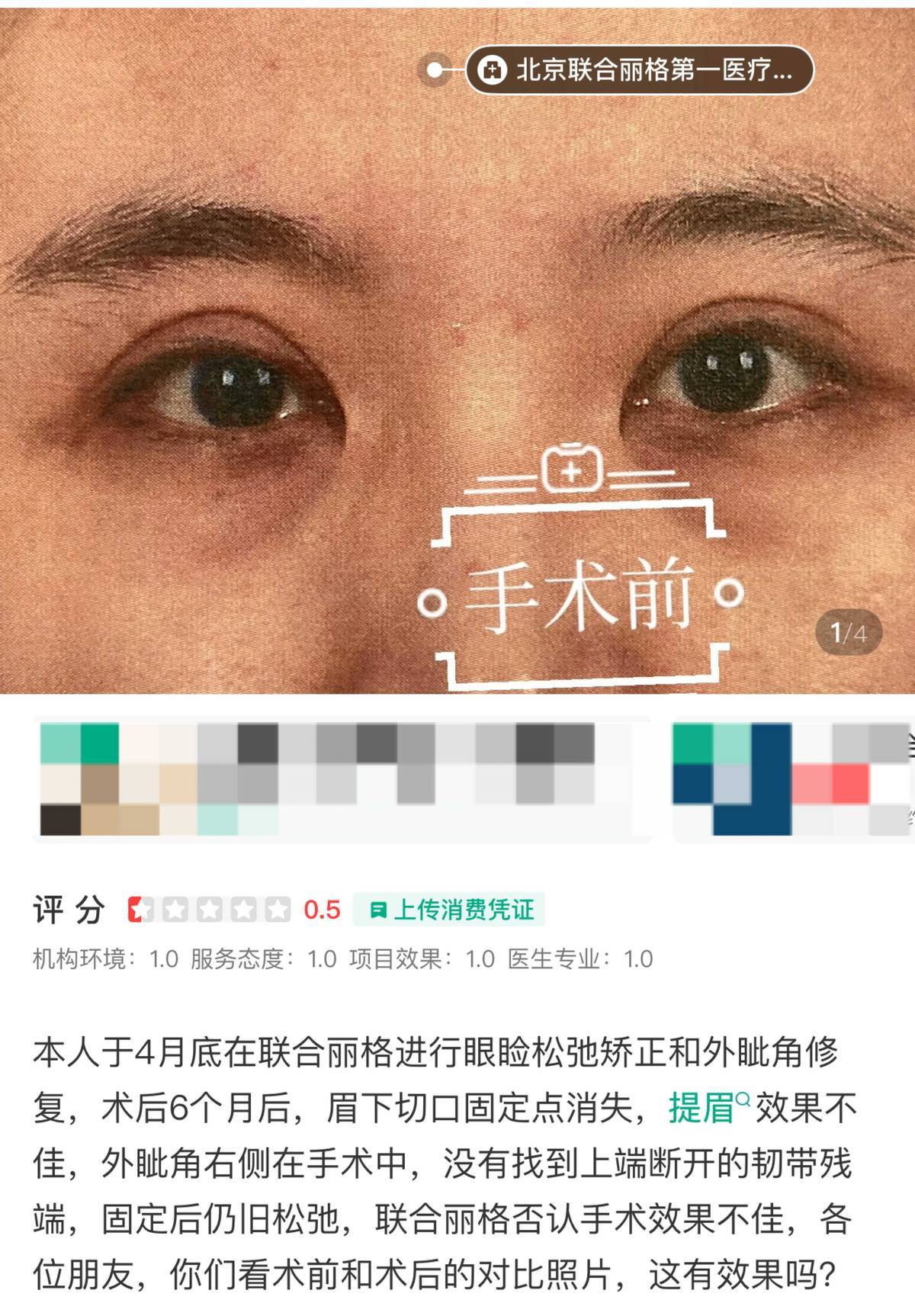 另有记录反映眼睑矫正术后出现眉下固定点失效、外眦角持续性松弛等现象,消费者称机构拒绝承认效果问题。