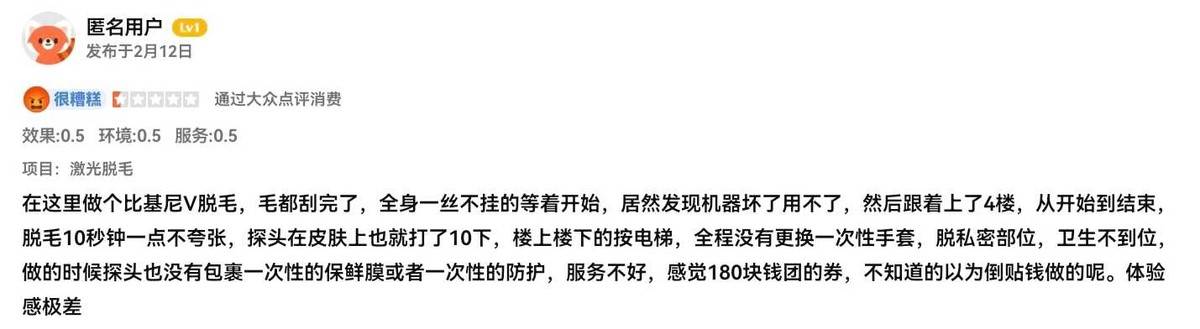 2月12日,另一位消费者对该院的激光脱毛项目给出了低分评价。她描述了自己进行比基尼V区脱毛的经历:在毛刮完毕、全身裸露等待操作时,被告知机器故障无法使用。随后被带到四楼,整个脱毛过程仅持续约十秒钟,探头在皮肤上仅接触了十次左右。该消费者指出操作医生在操作私密部位时全程未更换一次性手套,卫生措施不到位。同时,操作探头也未见包裹一次性保鲜膜或其他防护措施,服务体验感极差。她感叹道,感觉像是倒贴钱做项目,体验非常糟糕。