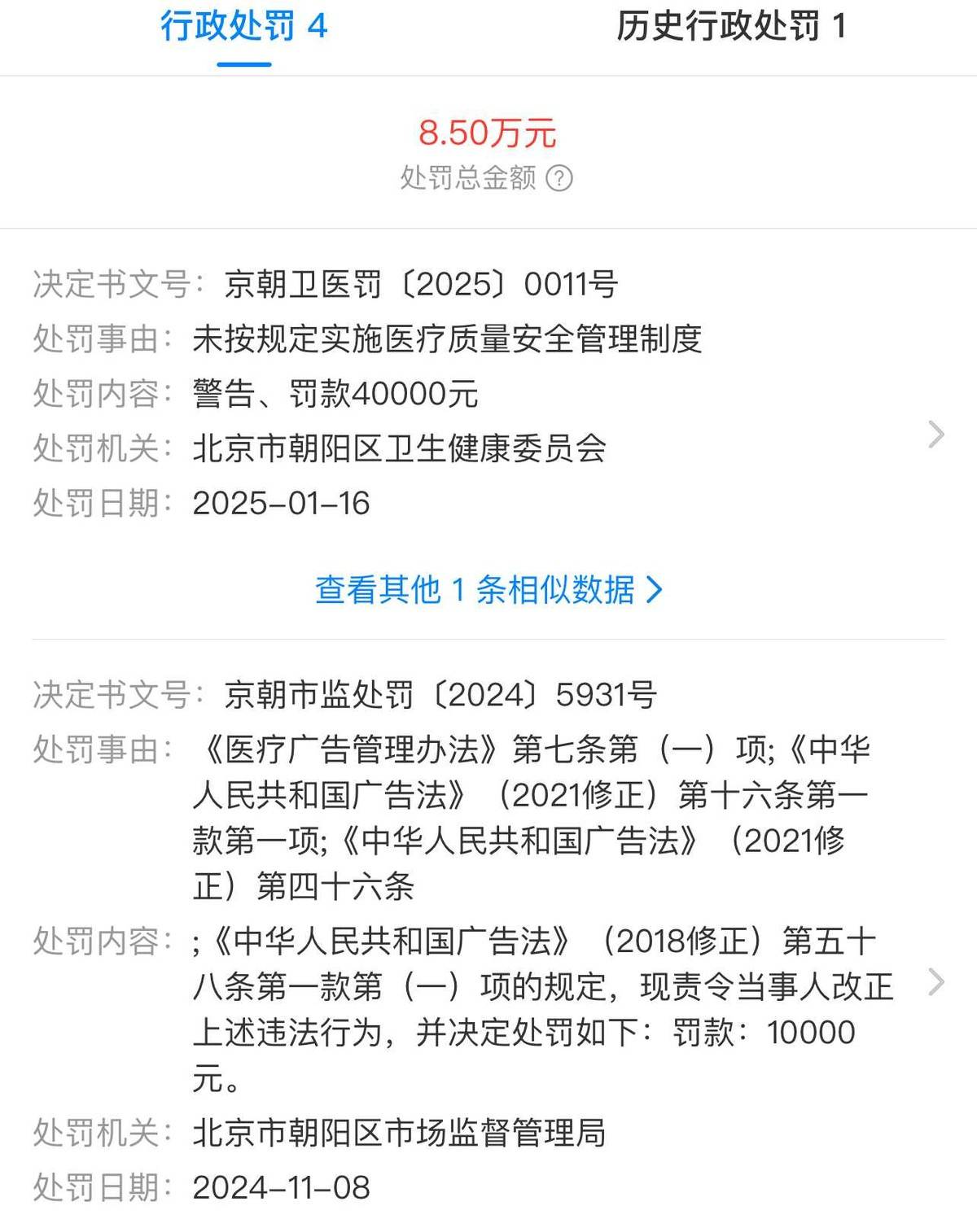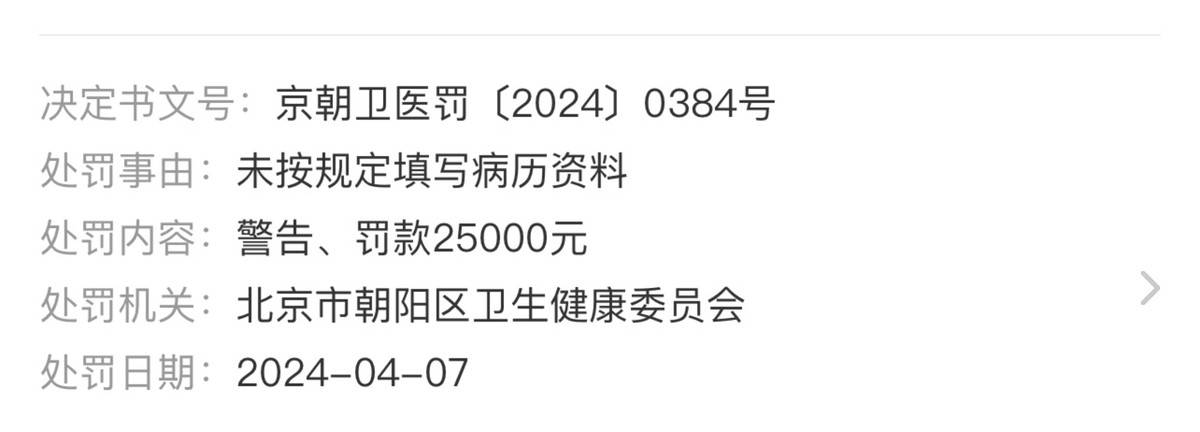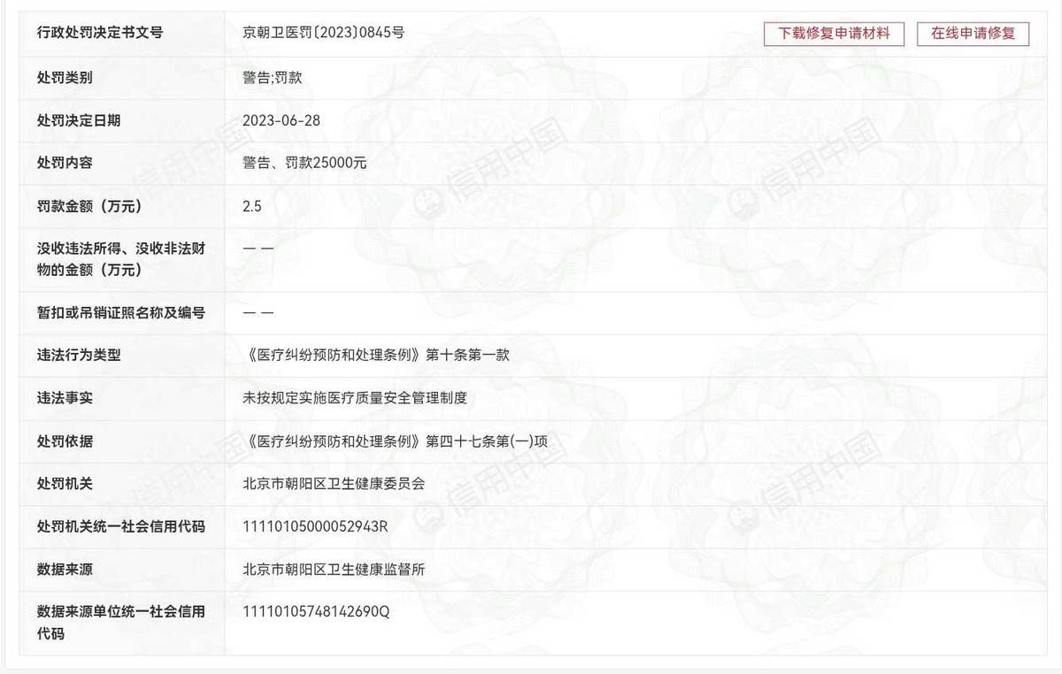 更早之前,2024年4月7日,北京联合丽格第一医疗美容医院有限公司因未按规定填写病历资料,违反《医疗纠纷预防和处理条例》第十五条第一款,依据第四十七条第(四)项被处以警告并罚款2.5万元。