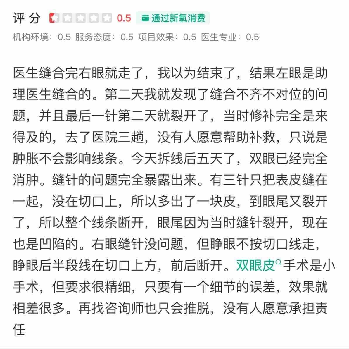 实际上,北京联合丽格医疗美容机构涉及双眼皮及相关眼部整形手术的消费者反馈持续多年存在。根据新氧平台可查证的消费后日记,有消费者描述手术过程中主刀医生仅完成单侧眼部缝合后离场,另一侧由助理医生操作,术后次日即发现缝合不齐、眼尾开裂等问题。多次请求补救未获处理,被告知肿胀不影响效果。拆线数日后记录显示出现表皮错位缝合导致皮肤组织异常、眼尾开裂凹陷及睁眼时切口线错位分离等情况。