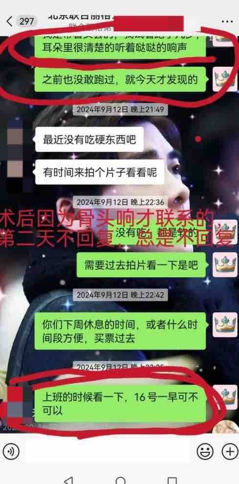 在术后长达一年的恢复期内,该消费者仅因发现一侧骨头有异响(担心手术并发症)而联系过销售三次,但每次均未获得有效回应或协助。第一次联系时,销售让其回北京拍片复诊,她规划好行程并告知复诊时间后,销售却未再回复确认安排。