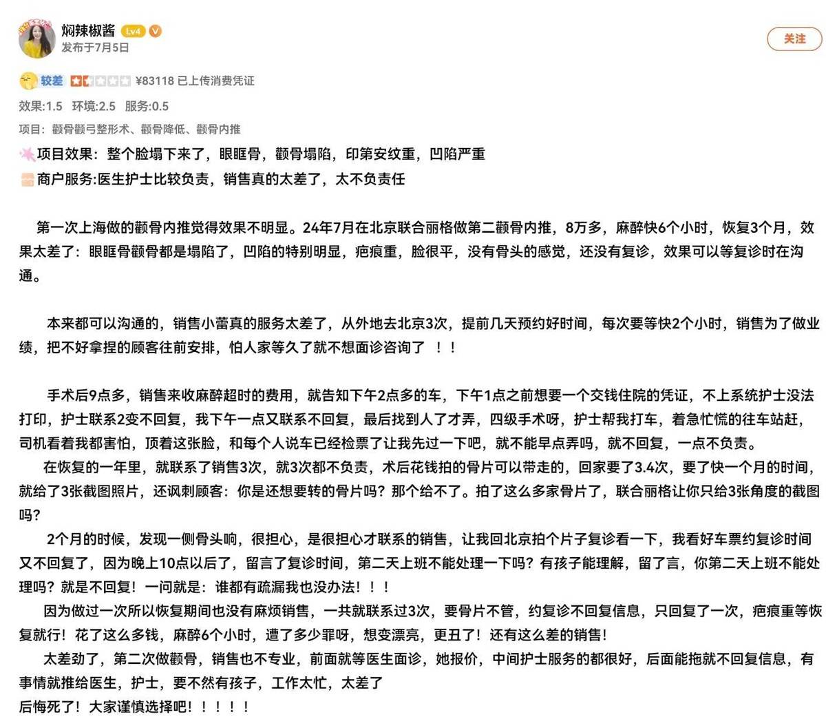 7月5日,一位消费者在大众点评平台对北京联合丽格第一医疗美容医院给出了差评,详细描述了其在该院进行二次颧骨颧弓整形术(包括颧骨降低、颧骨内推)后的失望经历。