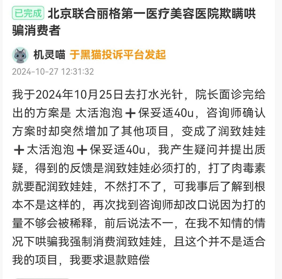 在这些公开投诉中,作为行业代表品牌之一的“联合丽格”品牌及其在北京运营的多家机构(如第一医院、太阳宫店、第二医院等)被多次提及。
