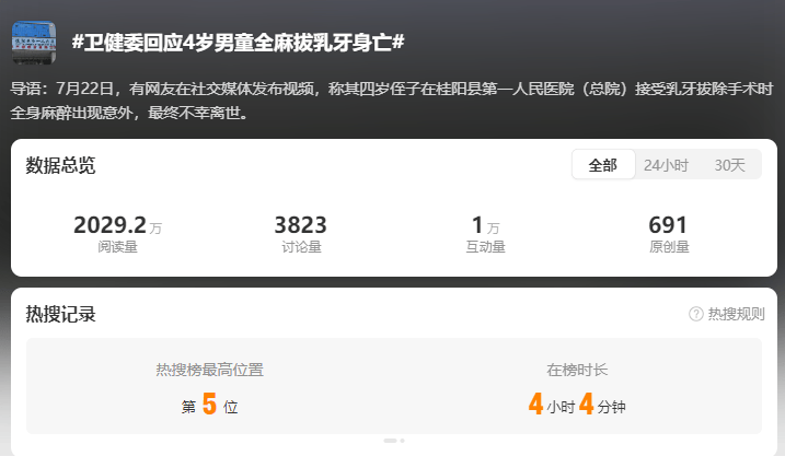 7月22日,有网友在社交媒体发布视频,称其四岁的侄子在湖南桂阳县第一人民医院(总院)接受乳牙拔除手术时全身麻醉出现意外,最终不幸离世。