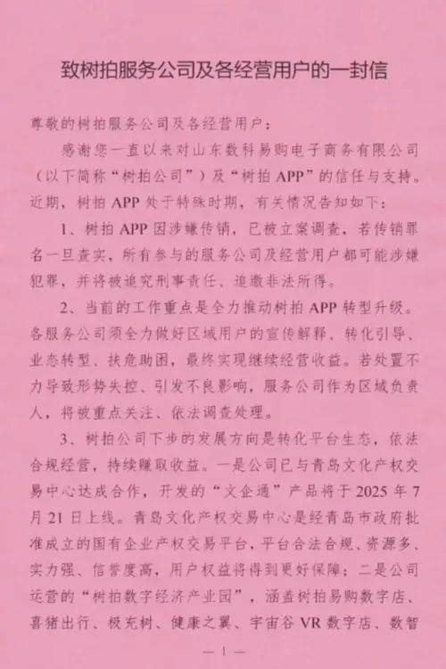 就在维权现场传出了几张有关此事的相关通告。一则是落款为山东数科易购电子商务有限公司于7月21日当天贴出的公告《致树拍服务公司及各经营用户的一封信》: