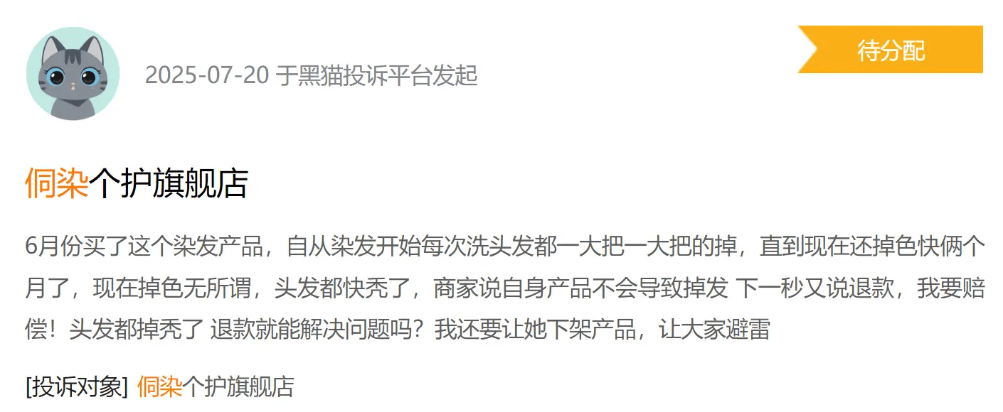 更令人担忧的是,该产品实际固色效果与宣传严重不符,染发后三天即出现明显掉色现象。这种“宣传天花乱坠,效果一地鸡毛”的套路,与佛山市场监管部门2024年查处的虚假广告案例如出一辙国家市场监督管理总局。黑猫投诉平台的数据显示,截至2025年3月,针对侗染染发剂的投诉已超过3000条,涉及过敏反应、虚假宣传等多个维度。