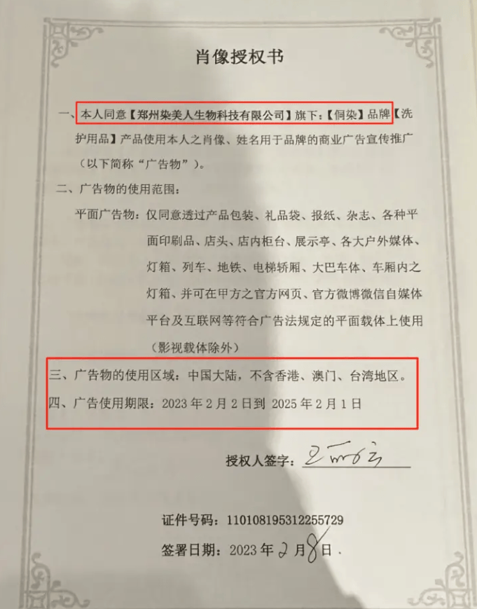 根据编号110108195312255729的《肖像授权书》显示,王丽云曾于2023年2月2日至2025年2月1日期间,授权郑州染美人生物科技有限公司在特定范围内使用其肖像。值得关注的是,消费者张先生在2025年3月购买的侗染产品,仍显著标注“王丽云推荐”字样,这一时间上的明显错位,直接违反了《广告法》第二十八条关于虚假宣传的禁止性规定国家市场监督管理总局。