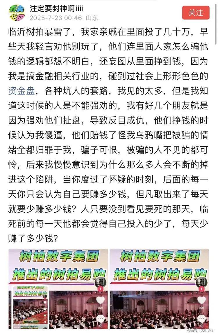 7月23日,山东网友爆料,临沂树拍暴雷了,亲戚在里面投了几十万。