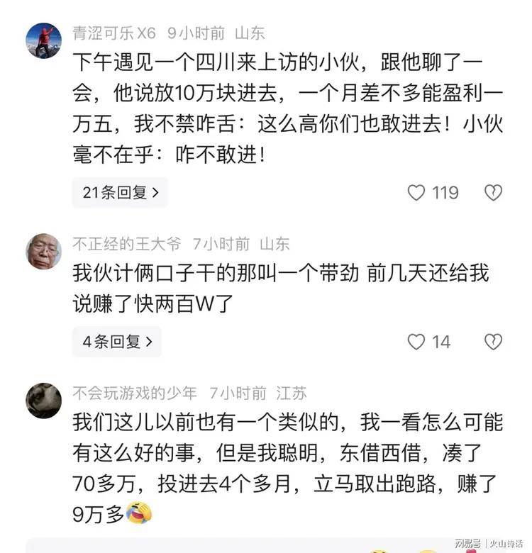 针对此事,有网友表示,下午遇见一个四川来上访的小伙,跟他聊了一会,他说放10万块进去,一个月差不多能盈利一万五,我不禁咋舌:这么高你们也敢进去!小伙毫不在乎:咋不敢进!