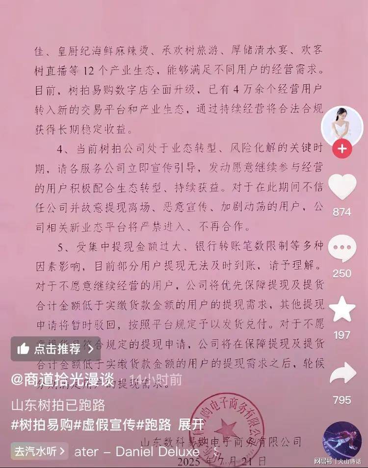 目前,树拍易购数字店全面升级,已有4万余个经营用户转入新的交易平台和产业生态,通过持续经营将合法合规获得长期稳定收益。