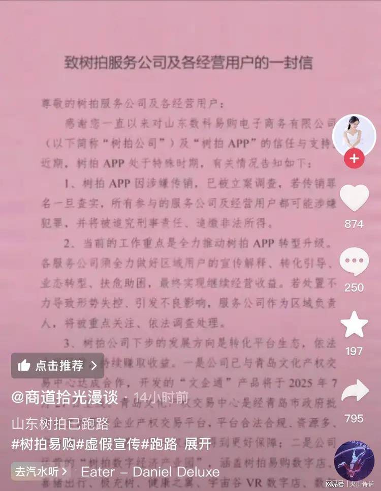 《致树拍服务公司及各经营用户的一封信》,其中提到,树拍APP因涉嫌传销,已被立案调查,若传销罪名一旦查实,所有参与的服务公司及经营用户都可能涉嫌犯罪,并将被追究刑事责任、追缴非法所得。