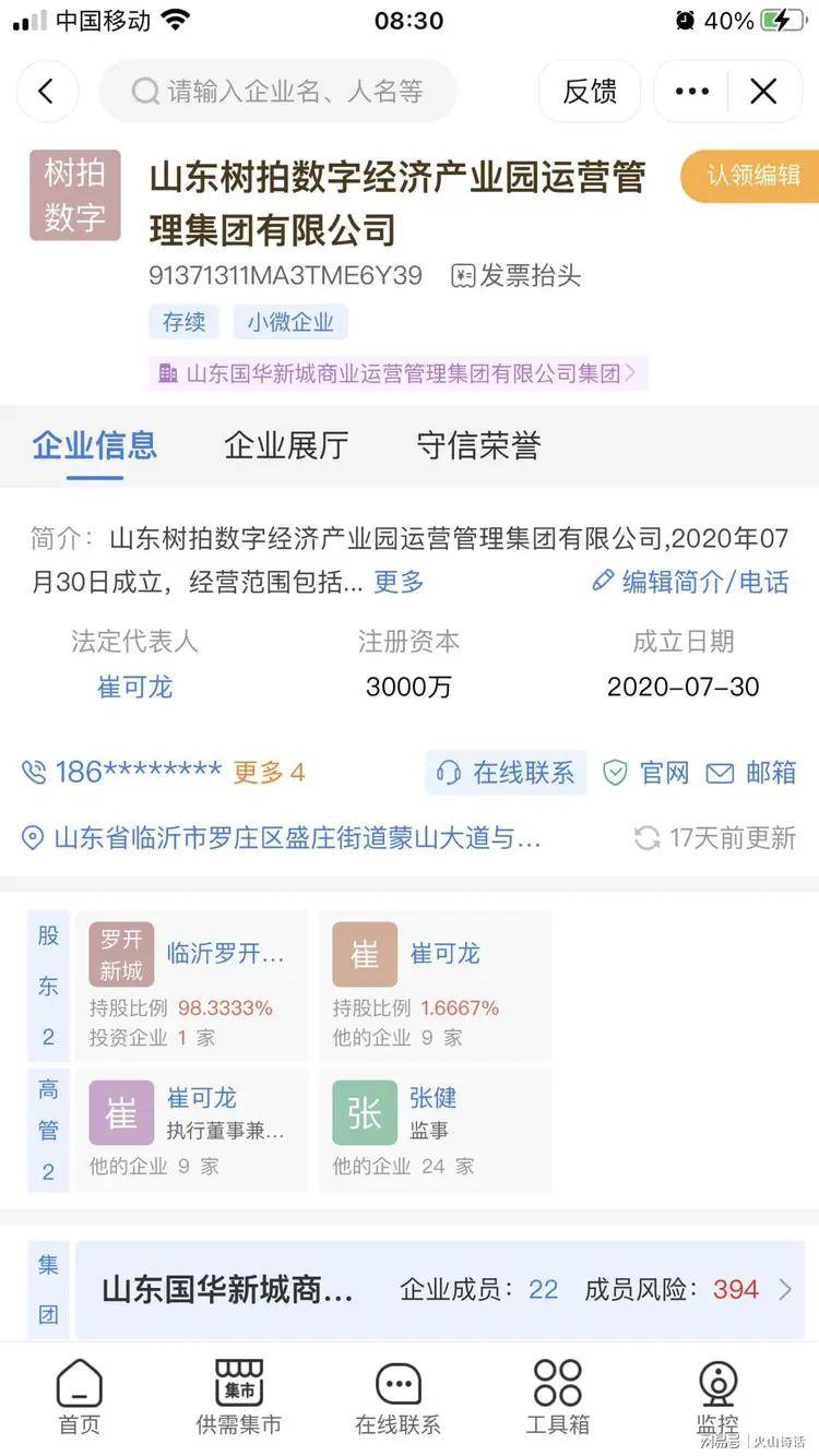 其母公司山东树拍数字经济产业园运营管理集团有限公司成立于2020年7月,注册资本3000万,法定代表人也是崔可龙。
