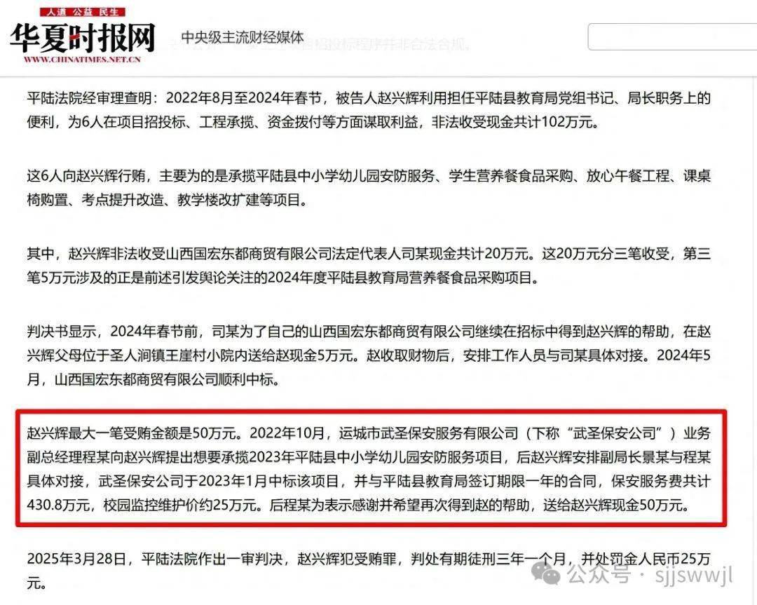 后被告人赵兴辉安排副局长景某与程某具体对接,武圣保安公司于2023年1月顺利中标该项目,并与平陆县教育局签订期限一年的合同,保安服务费共计430.8万元,校园监控维护价约25万元。后程某为表示感谢并希望再次得到赵的帮助,送给赵兴辉现金50万元。