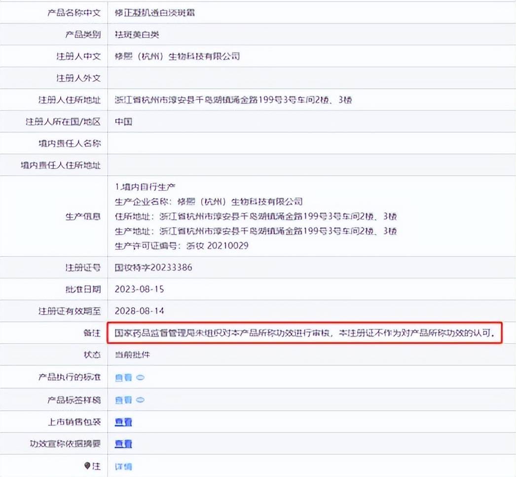 然而,央广网记者在国家药监局网站上搜索时发现,该产品备注栏说明:“国家药品监督管理局未组织对本产品所称功效进行审核,本注册证不作为对产品所称功效的认可。”
