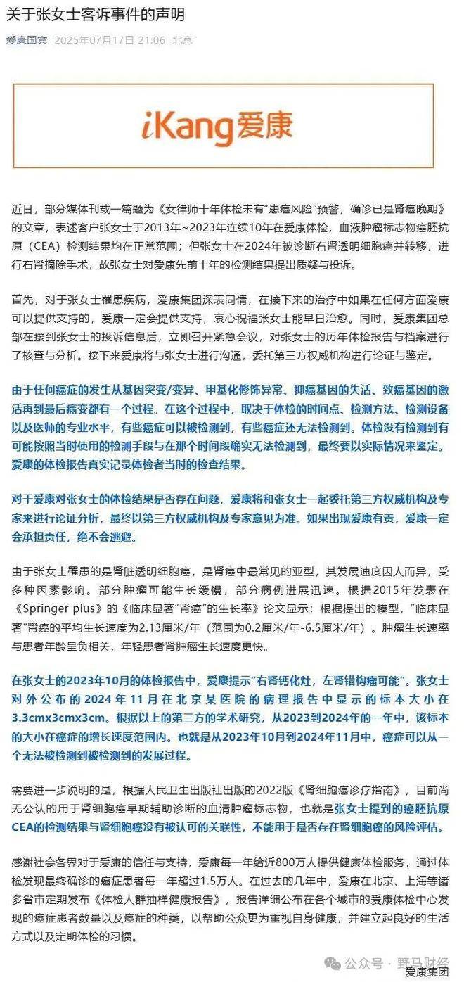 此外,爱康国宾还提到,癌症发展存在从基因突变到癌变的漫长过程,能否检出取决于“体检时间点、检测方法、设备及医师专业水平;此外,引用学术论文声称肾癌年均增长约2.13厘米,认为张晓玲2023年从钙化灶到2024年3.5厘米肿块的变化“在癌症增长合理速度范围内”;另外,强调根据人民卫生出版社出版的2022版《肾细胞癌诊疗指南》,目前尚无公认的用于肾细胞癌早期辅助诊断的血清肿瘤标志物,也就是癌胚抗原CEA的检测结果与肾细胞癌没有被认可的关联性。