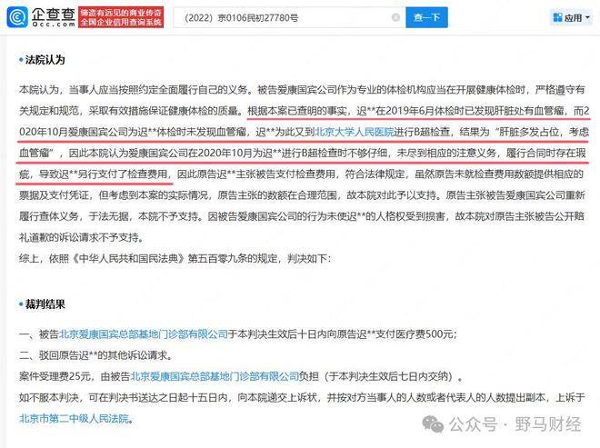 根据裁判文书网上2023年的一则判决显示,爱康国宾旗下北京爱康国宾总部基地门诊部也曾因医疗服务纠纷被起诉。原告在2019年6月体检时已发现肝脏处有血管瘤,而2020年10月在爱康国宾公司体检时未发现血管瘤,原告为此又到北京大学人民医院进行B超检查,结果为“肝脏多发占位,考虑血管瘤”。法院认为,爱康国宾公司在2020年10月为原告进行B超检查时不够仔细,未尽到相应的注意义务,导致原告另行支付检查费用,一审判决向原告支付医疗费500元和案件审理费25元,二审驳回该公司上诉。