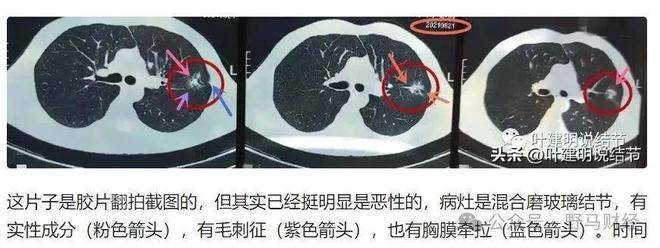 李先生说:“我质疑爱康卓悦存在重大疾病的漏诊,就找专家咨询。杭州市肿瘤医院胸外科主任医师叶建明把爱康国宾的CT和医院的CT进行了比对,指出左上肺有一个约2.7厘米的混合磨玻璃结节,这个病灶体检时已经存在,但体检报告上并未对此进行告知。叶医生还把我作为典型案例写了一篇说结节的科普文章中。”
