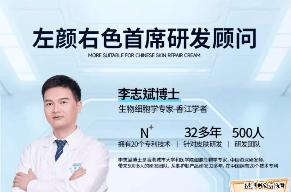 而左颜右色天猫旗舰店页面宣传,李志斌博士是香港城市大学和医学院细胞生物学专家,中国资深研发师,带领500多人的研发团队,从事护肤产品研发32年,在中国拥有20个技术专利。