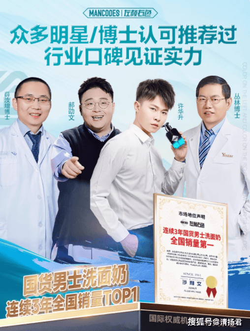 根据张先生提供的线索,清扬君在左颜右色天猫旗舰店找到了这款“微酸祛痘洗面奶”。该产品宣称“连续3年国货男士洗面奶全国销量第一”“连续3年全国销量TOP1”,并强调获得“众多明星/博士推荐”,包括薛竣增博士、郝劭文、许华升、丛林博士等,以此佐证其“行业口碑与实力”。