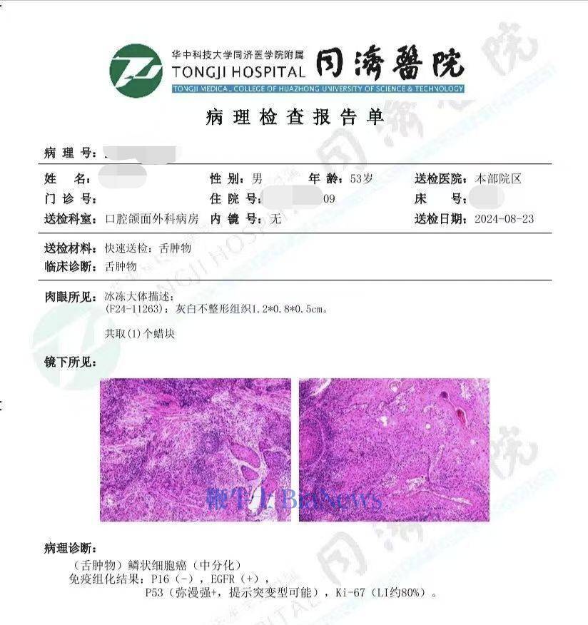2024年8月,他岳父在华中科技大学同济医学院附属同济医院确诊舌癌,病理结果为(舌肿物)鳞状细胞癌(中分化)。“不止病人受罪且花费巨大,其他检查费用不论,手术花费4万有余,且后期放疗费用也需要4万-5万。”