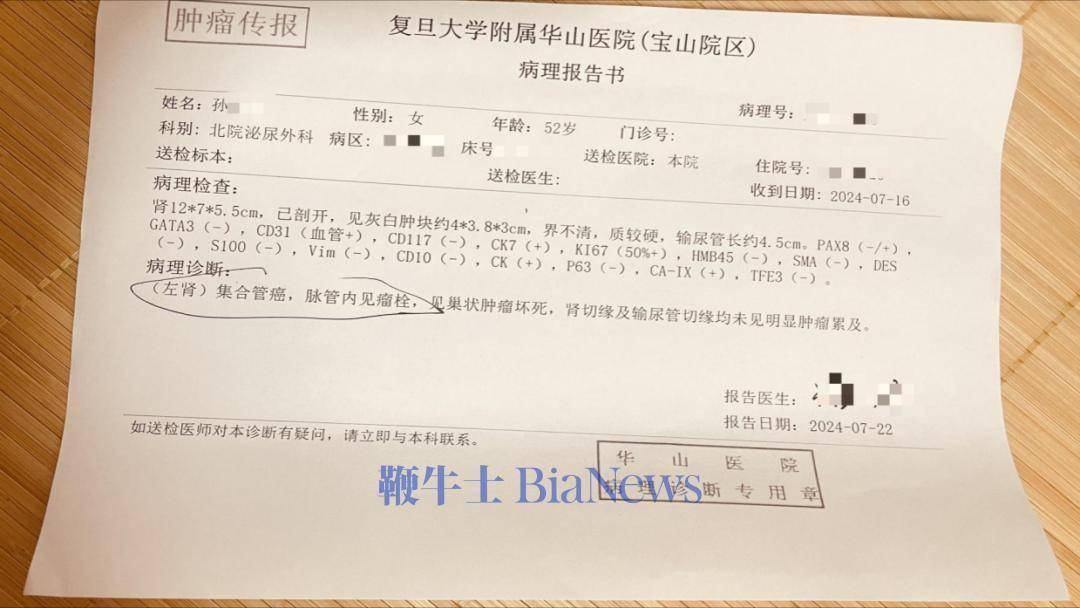 2024年6月24日,她因“腹痛、血尿”至宜兴第一医院急诊治疗;病情没有好转之下,于7月15日至上海复旦华山医院就诊,随后被确诊为“左肾集合管癌”。