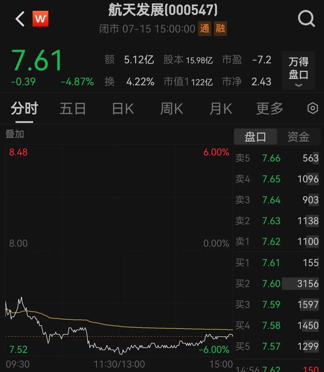 截至7月15日收盘,航天发展股价报7.61元/股,跌4.87%,市值约为122亿元。