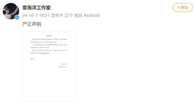 2024年10月7日,自称是覃海洋未婚妻的网友发文称覃海洋多次出轨。同日,覃海洋工作室发布严正声明,针对恶意抹黑运动员形象、歪曲事实、蓄意散播运动员嫖娼等不实言论行为,工作室正在收集整理相关证据,必要时向公安机关报案。