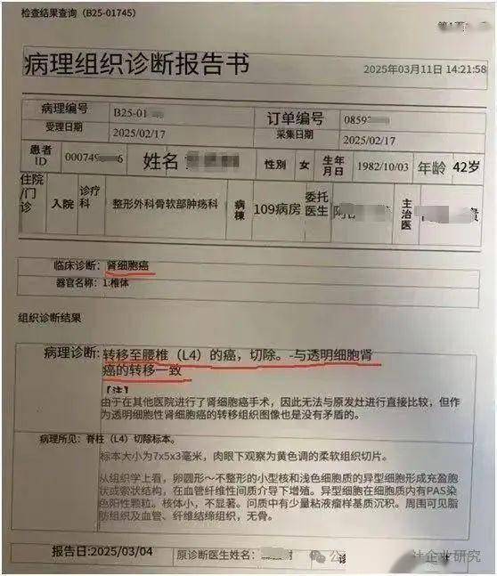 2024年10月,张晓玲在北京大学国际医院被怀疑“右肾透明细胞癌”,进行右肾摘除手术后,病理显示为“透明细胞型肾细胞癌”。由于手术后仍感觉身体不适,张晓玲在2025年2月又到国外的医院进行了检查,结果被确诊为“肾癌骨转移”,而且骨转移已经达到了晚期程度。