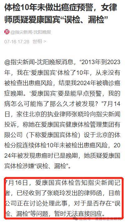 据媒体报道,爱康国宾体检告知媒体,已经收到了张晓玲发出的律师函,目前公司正在讨论处理此事,对于是否存在“误检、漏检”等问题,暂时无法直接回应。