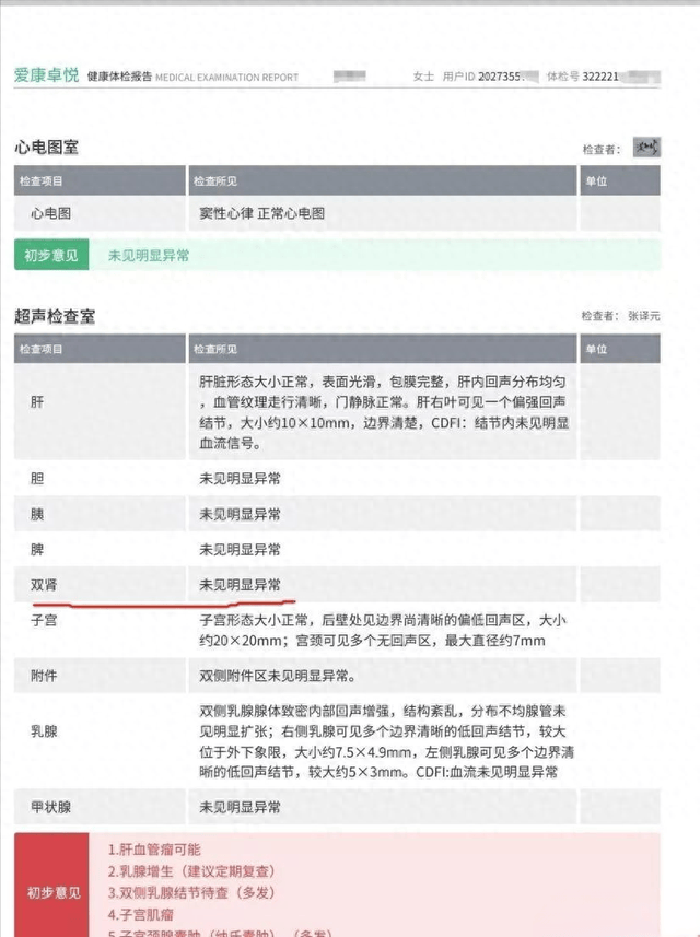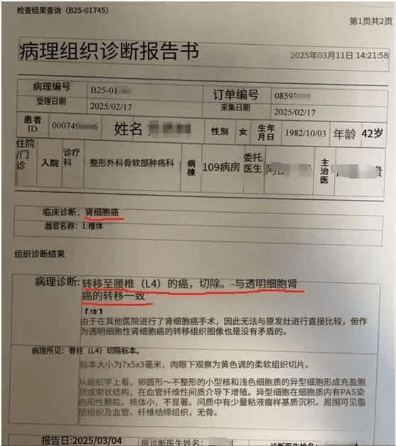 张晓玲表示,从2013年至2023年,她每年都在爱康国宾体检分院进行体检,2022年之前的体检报告中,双肾的体检结果均为“未见明显异常”。2024年,她在另一家体检机构被发现右肾有低回声肿块,随后在北京大学国际医院被确诊为“右肾透明细胞癌”,并进行了右肾摘除手术。术后,张晓玲仍感觉身体不适,2025年2月在国外医院被确诊为“肾癌骨转移”,且已到晚期。