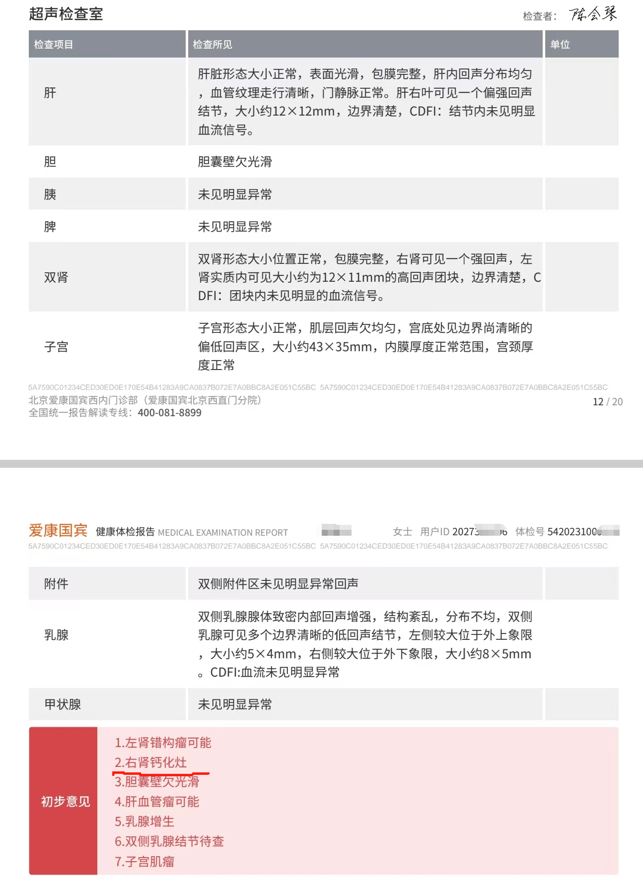2023年的体检报告,虽然提示右肾有“钙化灶”,但是爱康国宾体检并未告知她有患癌风险。不久前,她拿着2023年的体检报告再次找到爱康国宾体检的医生进行解读时,对方仍告知她:“属正常范围,不需要任何处理。”