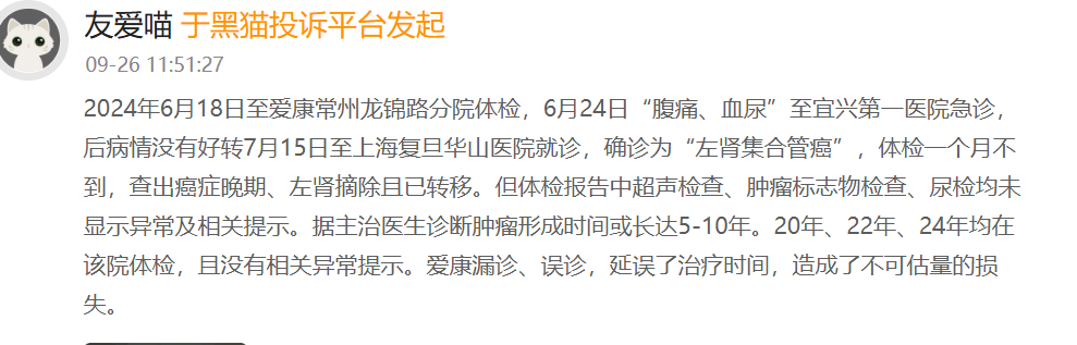 “2013年到2023年,我在‘爱康国宾’体检了10年,从来没有被检查出患癌风险,结果我2024年被确诊癌症晚期。‘爱康国宾’要是能早点预警,我的病怎么可能拖了那么久才被发现?”