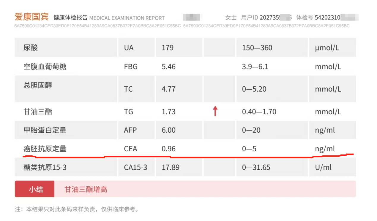 此外,张晓玲告诉指尖新闻记者,她一直都很关注爱康国宾体检对“癌胚抗原定量”的验血筛查,但这10年的体检报告中,她的“癌胚抗原定量”检测结果一直都在正常范围内。她在爱康国宾体检做了10年体检,从来没有被告知有“患癌风险”,对于她的肾脏和脊柱也没有发出“患癌预警”。