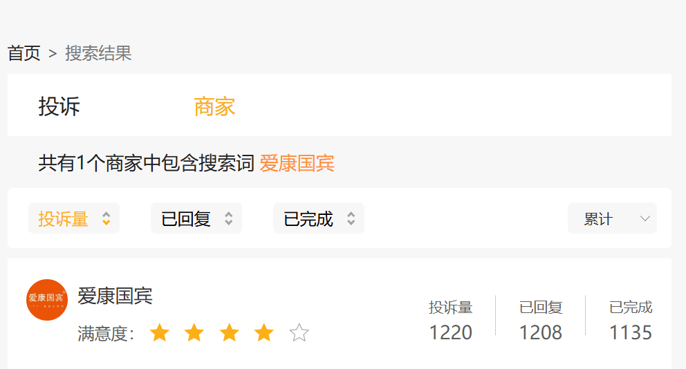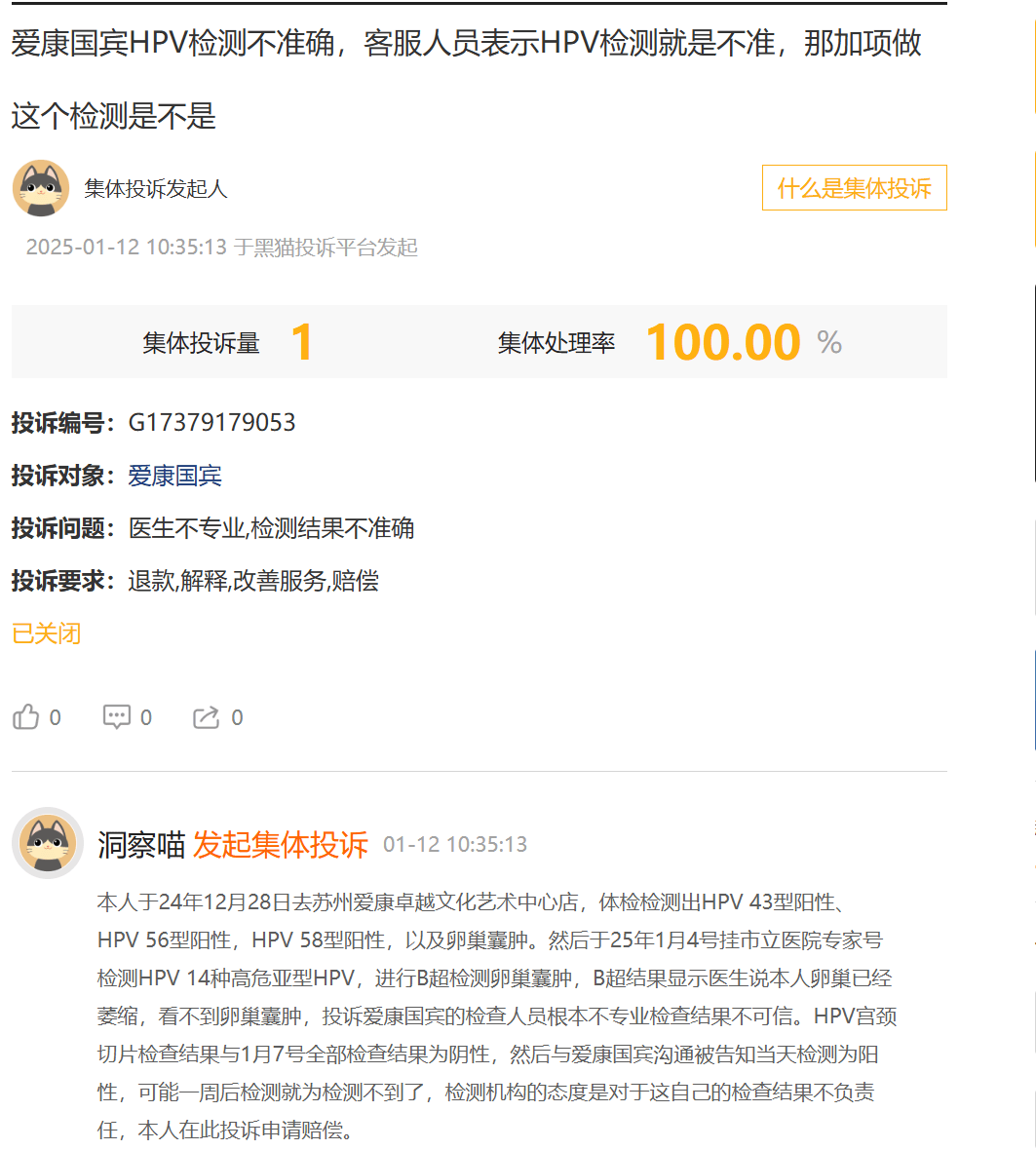黑猫投诉平台显示“爱康国宾”的投诉量(截图)