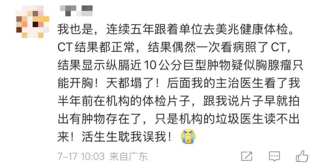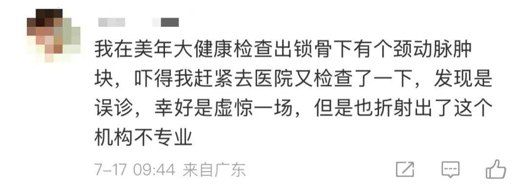 美年大健康也被指存在问题,有网友被误诊出颈动脉肿块。